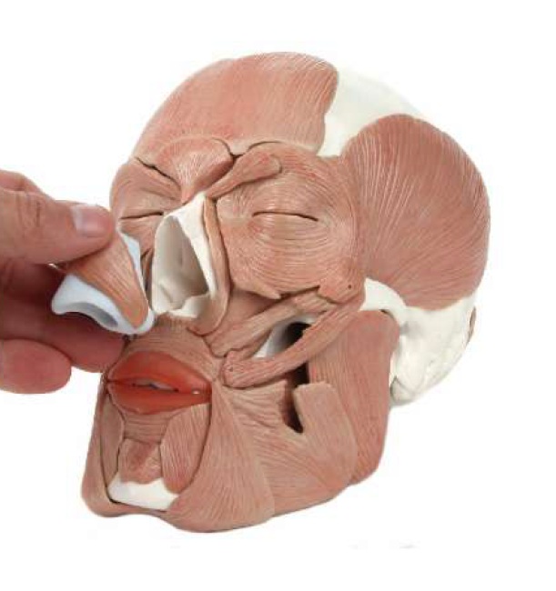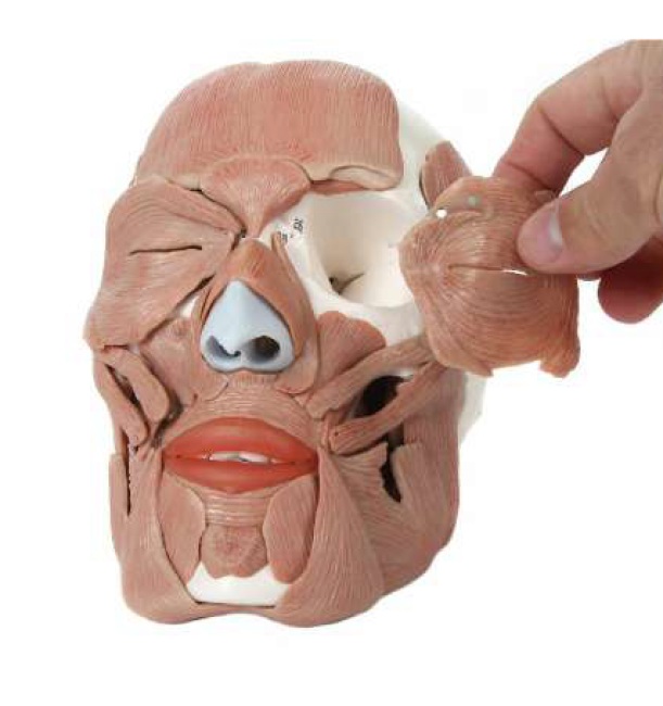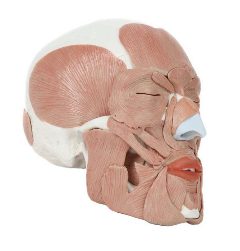 Modelo de cráneo con músculos masticatorios y de expresión facial.