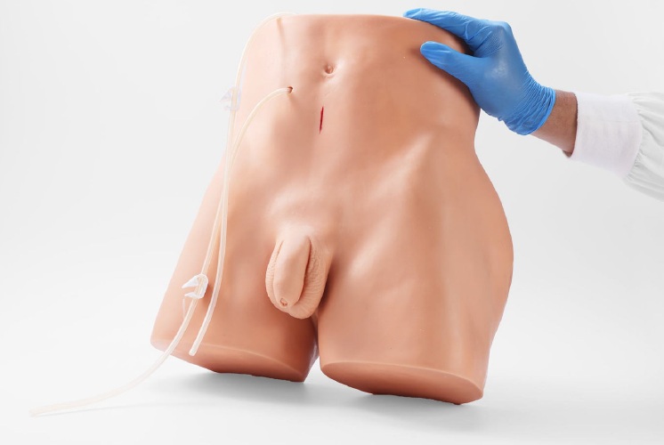 Este modelo está diseñado para la formación en diálisis peritoneal, facilitando la manipulación estéril de los tubos de drenaje y los procedimientos de enfermería asociados.
