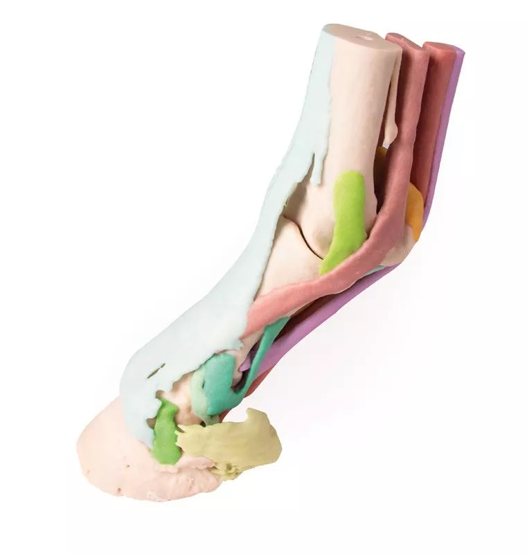 La serie completa está compuesta por cuatro modelos progresivos, que van desde una visión completa del pie (Modelo 1), incluyendo 25 estructuras anatómicas detalladas, hasta modelos que presentan reducciones paso a paso para exponer estructuras más profundas. Esta secuencia de modelos facilita la comprensión de la anatomía interna en capas, permitiendo observar cómo las distintas estructuras se superponen e interactúan entre sí.