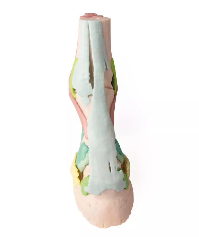 Este modelo representa fielmente la estructura del pie equino en posición de apoyo, diseñado con tecnología de punta a partir de datos co-registrados de tomografía computarizada (CT) y resonancia magnética (MRI). Gracias a la integración de estas dos técnicas de imagenología médica, se logra una representación tridimensional extraordinariamente precisa, anatómicamente correcta y a tamaño real.