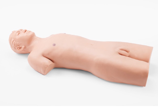 Simula la mitad superior del cuerpo de un adulto en decúbito supino con piel suave y realista.