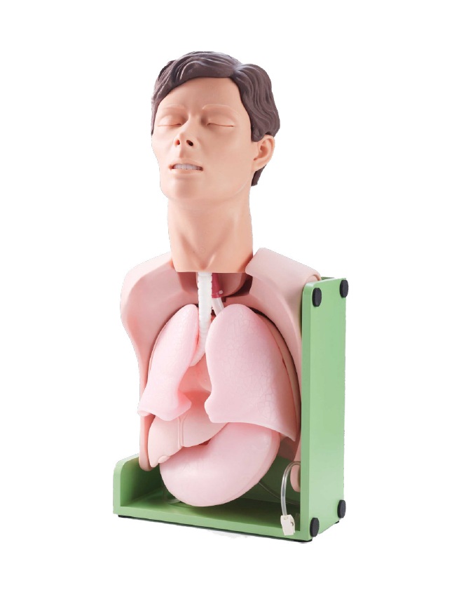 El simulador incluye una cabeza y un cuello totalmente realistas con materiales faciales blandos, una cavidad oral detallada (dientes, lengua, úvula) y una estructura completa de las vías respiratorias (epiglotis, glotis, laringe y tráquea). También cuenta con un estómago transparente y pulmones realistas, lo que permite diversas posiciones (decúbito supino, lateral izquierdo, sentado).